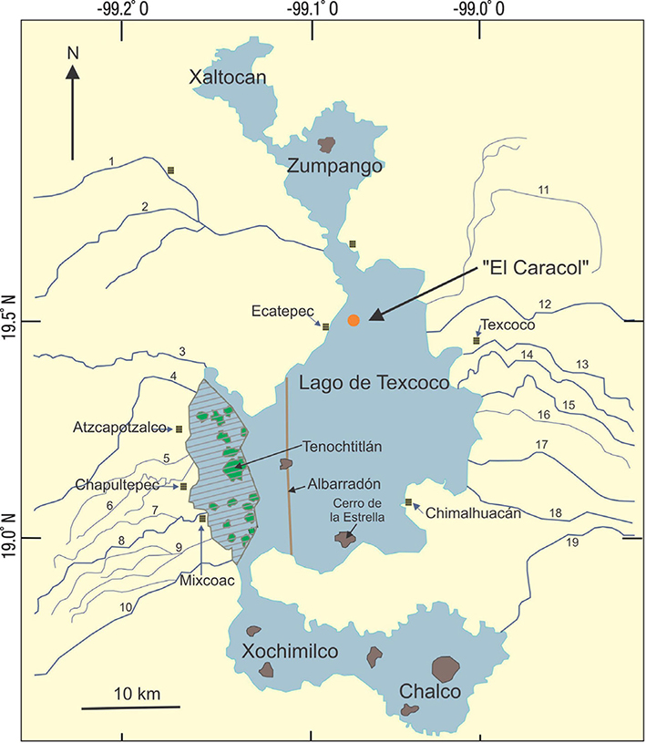 Figura 1 Reconstrucción del lago de Texcoco a la llegada de los españoles, donde se muestra el dique de Netzahualcóyotl (modificado de Armillas, 1971). Durante su último nivel más bajo por condiciones glaciales, los islotes pudieron ser parte de un traslape de diversos deltas (zona marcada con líneas horizontales) generados probablemente por los aportes de ríos procedentes de las sierras del occidente. Los ríos que desembocaban en el lago eran: 1) Tepotzotlán; 2) Cuautitlán; 3) Tlalnepantla; 4) río de los Remedios; 5) San Joaquín; 6) Morales; 7) Tacubaya; 8) La Piedad; 9) Mixcoac; 10) Magdalena; 11) San Juan Teotihuacán; 12) Papalotla; 13) Xalapango; 14) Magdalena; 15) Texcoco; 16) Chapingo; 17) Santa Mónica; 18) Coatepec, y 19) San Francisco. Los islotes y ríos son modificados de Niederberger-Betton (1987).