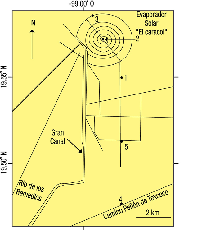 Posteriormente a este evaporador, conocido como El Caracol por su forma de espiral (Fig. 2), se enviaban a su vaso exterior salmueras (álcalis y cloruros de sodio) procedentes de pozos del lago. Las salmueras circulaban desde el vaso exterior del Caracol y de ahí hacia su vaso central; esto incrementaba por evaporación solar (Álvarez Jr., 1954) las concentraciones de salmueras. Desde el vaso central se enviaban las salmueras más concentradas hacia la planta de Sosa Texcoco S. A. para su posterior enriquecimiento y empleo en la producción de ceniza de sosa (soda ash) y cloruro de sodio.