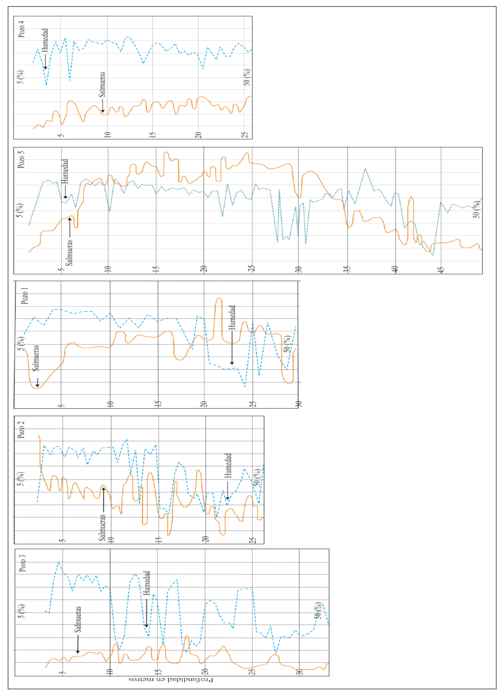 Los pozos hechos con perforadora de percusión presentan los máximos valores de salmueras alcalinas en el pozo 1 y en el pozo 5 (Fig. 3). En este último se observan valores mayores a 8% (entre 13 y 34 m de profundidad) lo que sugiere que hacia la mitad del lago de Texcoco (pozo 5) debió existir la mayor profundidad durante las máximas épocas de desecación, en donde se concentraban las salmueras más ricas en álcalis y cloruros. Estas sales superan por mucho la concentración de la salinidad del agua de mar.