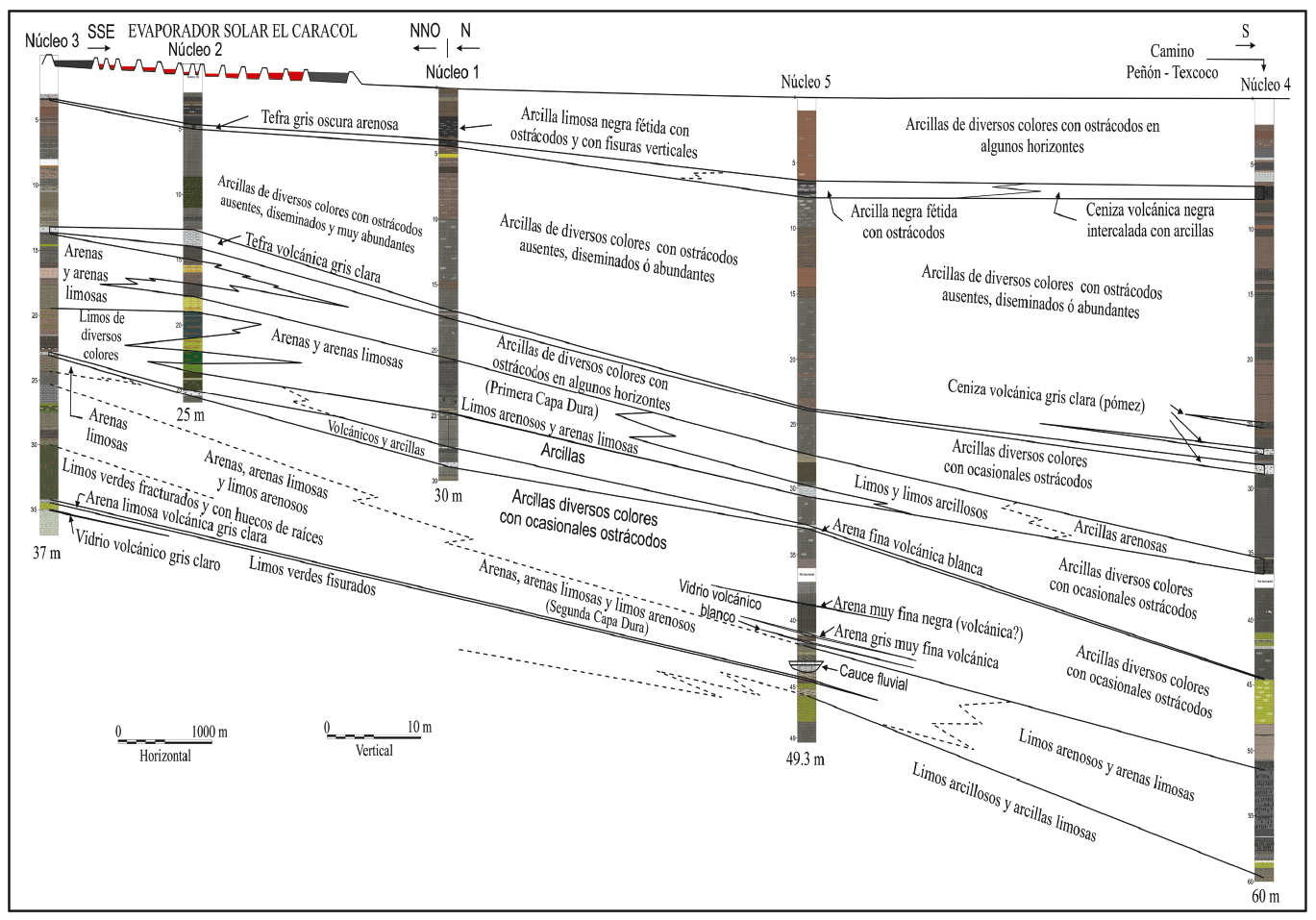 Figura 4 Correlación sedimentológica de muestras obtenidas con una máquina rotatoria con barril para recuperación continua de sedimentos. En este corte se aprecian además diversos horizontes de cenizas, tanto básicas como ácidas. Se observa el adelgazamiento del acuífero de salmueras conocido como capa dura y su cambio de facies limo arenosas con raíces o porosidad móldica dejada por raíces, a facies sedimentológicas de limos y limos arcillosos, con algunos sedimentos y arcillas arenosas hacia la posición meridional del pozo 4, perforado en el camino Peñón-Texcoco. Se observa que a mayor profundidad hay una segunda capa dura en los núcleos 3, 4 y 5, la cual también sirvió como capa productora de salmueras
