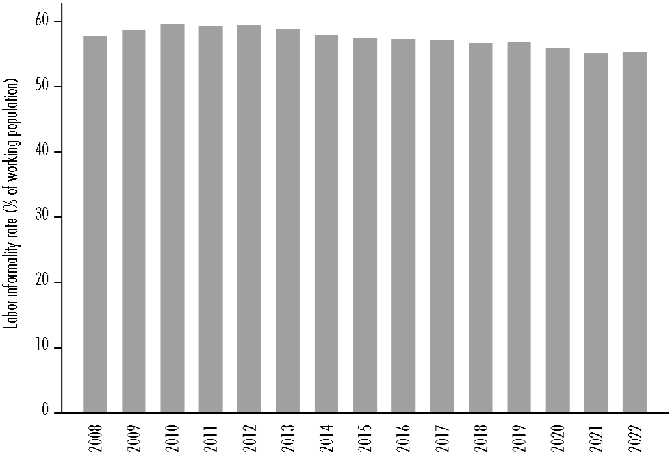 Informality is a structural condition of the labor market in Mexico. Despite implementing economic policies to reduce poverty, informal employment, which comprises employment in the informal sector and employment outside the informal sector, is a persistent phenomenon and continues to account for a significant proportion of total employment in the country. During the period 2008-2022, the average labor informality rate has been 57.5%. Approximately 32 million people worked under informal conditions in 2022. It could be said that Mexico’s labor market is characterized by what Hussmanns (2004) calls the “informalization of employment” which is a consequence of informal employment in the informal sector and informal employment in the formal sector.