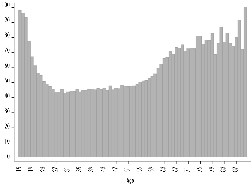 The age of the individuals is a factor influencing the probability of being an informal worker. In Mexico, around 12.5% of informal workers are between 15 and 21 years old, and around 11% are 60 or older. It is reasonable to think that young workers, especially if they go to school, are most likely to have an informal job because of their low human capital level (low experience) and frequently because of the schedule flexibility needed to combine employment and schooling. On the other hand, hiring older workers becomes less likely in the formal labor market because of their human capital depreciation; that is, updated technological skills are required to work in a competitive market. Also, older workers may have a shorter healthy life expectancy (the survival rates of people with chronic illness are rising, ILO-OECD, 2019), reducing the possibility of being formally hired. These arguments may explain why workers under 20 and over 60 are more likely to have an informal job, as shown in Figure 2. Other studies have also found the U-shaped relationship between informality rates and age (Galvis, 2012).
