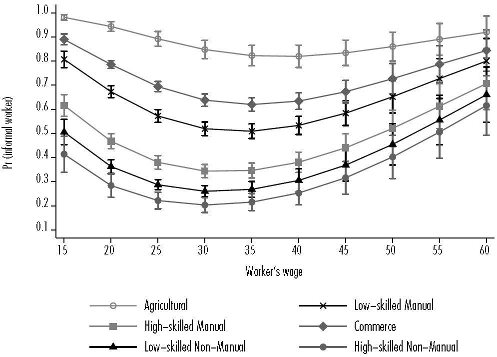The odds ratio analysis in Table 5 sheds light on understanding the relative probabilities by occupational category (all of them are statistically different from 1). At the age of 30, for example, it is 2.5 times more likely to be an informal worker if having an occupation in Commerce than a Low-skilled Non-Manual occupation, and these odds decrease as the worker ages. At 30, a worker is 1.5 times more likely to be informal if he/she has a Low-skilled occupation than a High-skilled Manual occupation and 1.3 times more likely if the comparison is between Low-skilled and High-skilled Non-Manual occupations. In all cases, the odds decrease with age.
