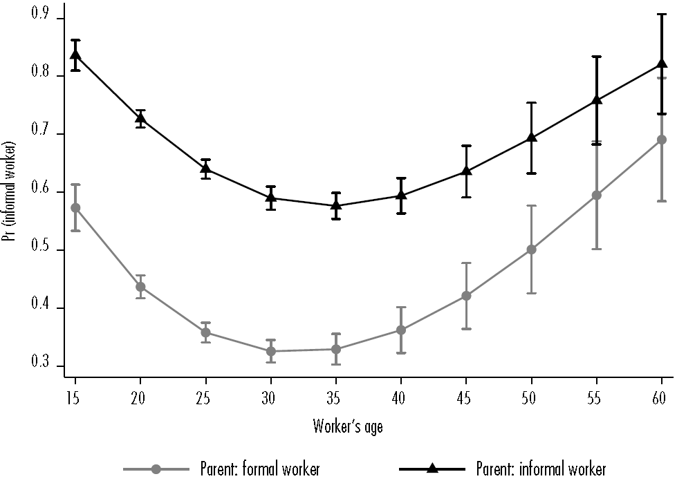 Continuing with the analysis of average marginal effects (see Table 4), we may observe that having a household head parent informally working increases the adult child’s probability of being an informal worker by 15.3 percentage points on average. This means that there is an intergenerational transmission or inheritance effect of labor decisions as children have a propensity to stay working under informal labor conditions as their parents. Figure 4 shows predicted probabilities by age for workers with informal and formal household head parents. The average predicted probability of being an informal worker if the worker’s parent is working under informality is 0.67, while if the worker’s parent is a formal worker, the average probability is 0.4; that is, on average, it is 1.7 times more likely for a worker to be informal if his/her household head parent is also an informal worker. The estimated odds ratios change with the worker’s age, reaching 1.8 at age 30.