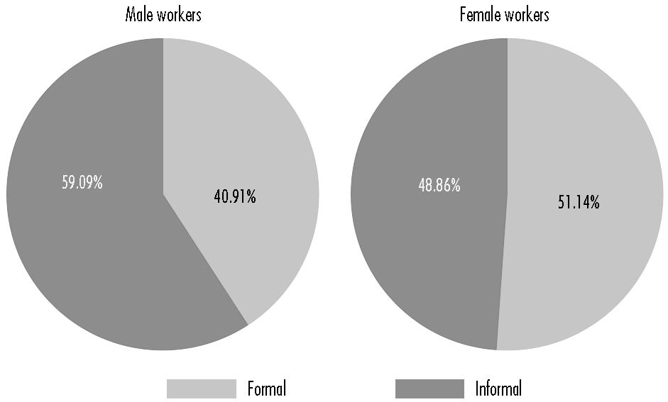 Based on the defined sample, the population under study is characterized by 55.21 and 44.79% of workers with informal and formal jobs, respectively; 38% are female workers aged 25.8 years on average, and 62% are male workers aged 24.5 years on average (see Table 1). Regarding educational level, the sample comprises 34.7% of workers having at most secondary School (basic education), 37.4% with at most High School or a Technical College degree, and 28% with a University degree. The percentage of working students in the sample is relatively small (16.3%), single workers are the most in the sample (81.7%), and workers from urban areas represent 48.6% of the sample.