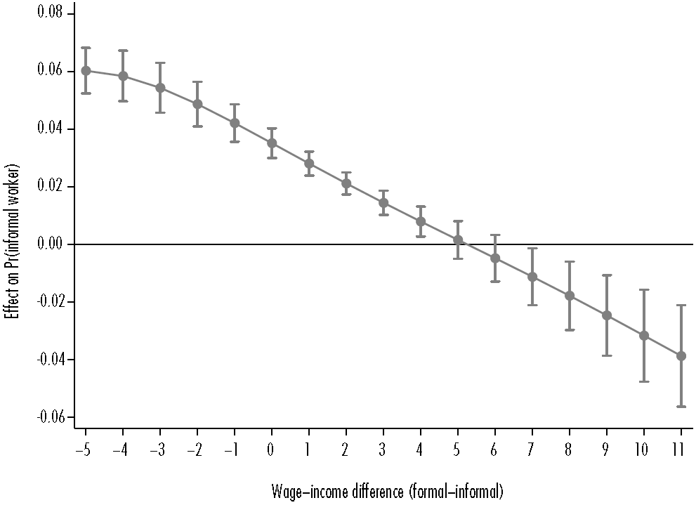Our findings also show that formal-informal wage differentials significantly influence the propensity to be an informal worker. However, the sign and magnitude of this influence depend on the sign and magnitude of the wage-income difference. The inefficiencies in labor regulation and social security provision in Mexico may explain that, only when the formal-informal wage-income difference is positive and large enough, the probability of being informal will be reduced. Only when the benefits associated with a formal labor condition outweigh its corresponding costs (captured by the wage differentials in our model) is the worker less likely to become informal.