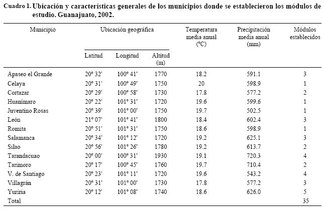 El estudio se realizó de abril a septiembre de 2002 en 35 módulos establecidos en trece municipios de Guanajuato, México (Cuadro 1).