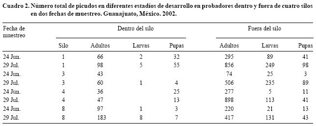 El número de picudos en estados inmaduros observados en los probadores (en dos fechas de muestreo) fue menor dentro del silo en comparación con el almacén del productor (Cuadro 2). Las pupas de Sitophilus sp. dentro del silo presentaron un tamaño menor, falta de turgencia y color oscuro en comparación con las observadas en el almacén del productor.