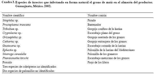 Para identificar los insectos que atacan el grano almacenado en Guanajuato y determinar su distribución, se tomaron mensualmente dos muestras de 250 g, cada una del interior del silo y de grano almacenado por el productor. A cada muestra se le determinaron los mismos parámetros que a los probadores y se identificaron los insectos presentes con base en las claves y descripciones publicadas en el Boletín United States Deparment of Agriculture, (USDA, 1965) Hinton y Corbet (1985) y Gutiérrez y Cortéz (1993) hasta género.