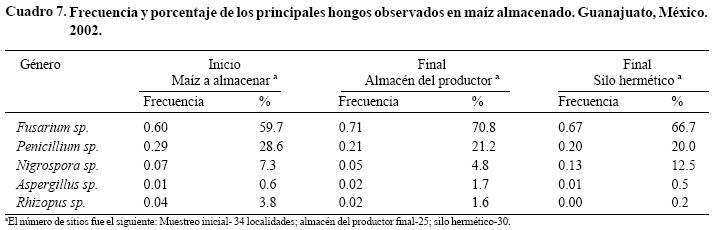 El porcentaje inicial de granos infestados por hongos fue de 48%. Bajo las condiciones de almacenamiento del productor se incrementó hasta 55.3%, mientras que dentro del silo se observó una ligera disminución de 36.3%.
