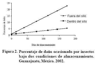 No obstante que se observó variación en el desarrollo de la población de insectos entre localidades y en sitios específicos, los daños alcanzaron valores finales de hasta 80%. La tendencia observada en el desarrollo de las poblaciones de insectos, como en el daño que ocasionaron fueron lineales. Sin embargo; la tasa de desarrollo y la del daño fue menor dentro del silo en comparación con el almacén del productor (Figura 2).
