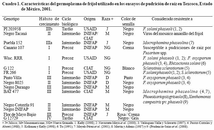 Germoplasma. Se estudiaron 15 genotipos de frijol de diferentes orígenes y hábitos de crecimiento, algunos de ellos considerados por otros investigadores como resistentes a las pudriciones de raíz (Cuadro 1).