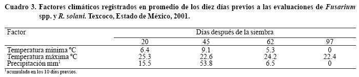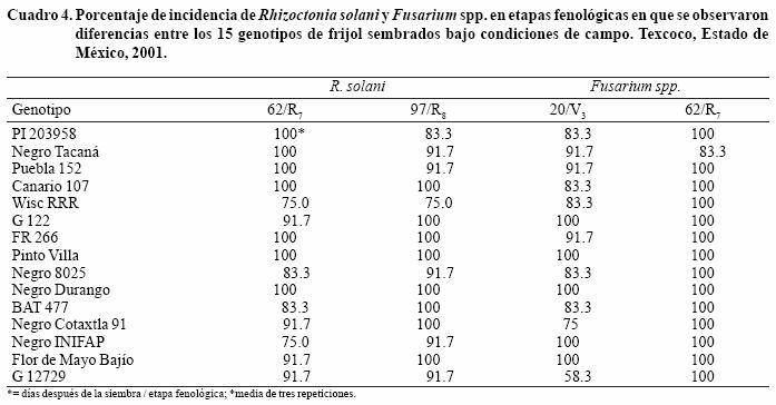 Incidencia de R. solani. Este hongo presentó 100% de incidencia en todos los genotipos, lo que sugiere una relativa uniformidad de la infestación del suelo en el sitio experimental. La incidencia se observó desde la etapa de la primera hoja trifoliada (V3, 20 dds) hasta la de prefloración (R5, 45 dds), en esta última etapa se registraron las más altas precipitaciones pluviales del ciclo, se acumularon 53.8 mm en los diez días previos a la evaluación (Figura 1) que corresponden al período de incubación del patógeno. En el muestreo de etapa de formación de vainas (R7, 62 dds) la incidencia del hongo fue 75% en algunos genotipos, lo cual se relacionó con una menor acumulación de lluvia (6.5 mm) y con la temperatura (Figura 1); en contraste, se observó un incremento en la incidencia de Fusarium spp. (Cuadro 4).