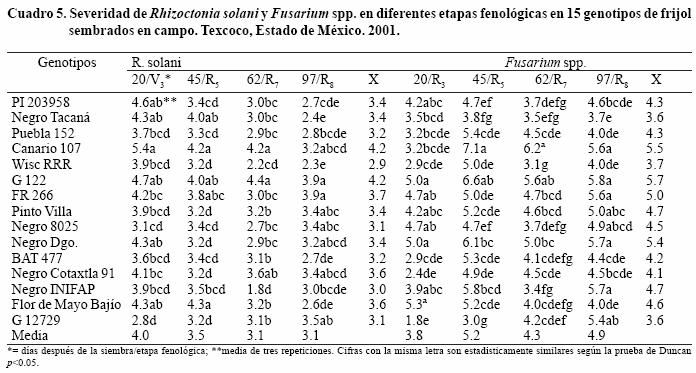Severidad de R. solani. En las diferentes etapas fenológicas se observaron diferencias significativas para la severidad de R. solani, el mayor daño ocurrió a los 20 dds en la etapa V3 (Cuadro 5). Lo anterior coincide con lo señalado por Mendoza y Pinto (1983), Sánchez y Cárdenas (1988) y Campos (1991), acerca de que los mayores daños por este hongo se presentan en las primeras etapas de desarrollo del cultivo. Durante ese periodo la temperatura media (18.9 °C) coincidió con la óptima para el desarrollo de la enfermedad, como indicó De la Garza (1996). El valor máximo de severidad por R. solani fue de 5.4 en Canario 107; es decir, 25% de los tejidos del hipocotílo y raíz mostraron lesiones, ablandamiento, pudrición y reducción del sistema radical (Schoonhoven y PastorCorrales, 1987) (Cuadro 2). Los genotipos con menor daño fueron: Puebla 152, Wisc RRR, Negro 8025, BAT 477, Negro INIFAP y G 12729. Los genotipos PI 203958, Negro Tacaná, Canario 107 y Flor de Mayo Bajío tuvieron valores de severidad altos (> 4.0) en las primeras etapas fenológicas y posteriormente descendieron conforme la planta llegaba a la etapa de madurez, al grado de que en la etapa R7 fueron resistentes. Esto estuvo influenciado por el clima prevaleciente durante ese período, así como por la etapa fenológica de las plantas.