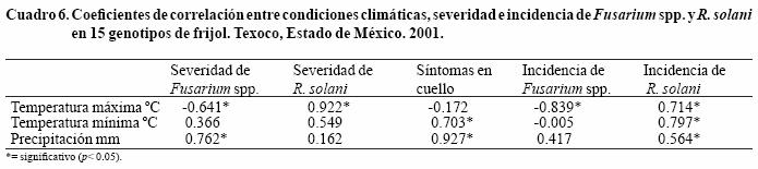La severidad e incidencia de Fusarium spp. mostró correlación negativa significativa (r= 0.641 y r= 0.839) con la temperatura máxima, mientras que para la severidad e incidencia de R. solani las correlaciones fueron positivas (r= 922 y r= 0.714). Por el contrario, la severidad de Fusarium spp. y los síntomas en el cuello de las plantas mostraron correlación positiva significativa (r= 0.762 y r= 0.927) con la precipitación (Cuadro 6). Los genotipos Negro INIFAP, Negro Durango, Flor de Mayo Bajío y G 122 mostraron incidencia de 100% desde la primera observación; es decir, son susceptibles a este hongo.