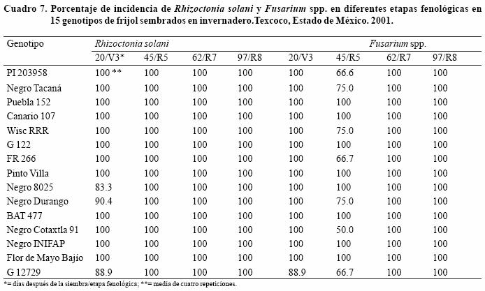 Incidencia de R. solani. La incidencia de este hongo fue del 100% en todo el ciclo del cultivo para la mayoría de los genotipos, a excepción de Negro 8025, Negro Durango y G 12729, los cuales mostraron 83.3%, 90.4% y 88.9%, respectivamente, en la etapa V3 (Cuadro 7).La incidencia se relacionó con la severidad en la primera observación (20 dds) (r= 0.51). En general, los valores de incidencia de R. solani se incrementaron con el desarrollo del cultivo (Cuadro 7).