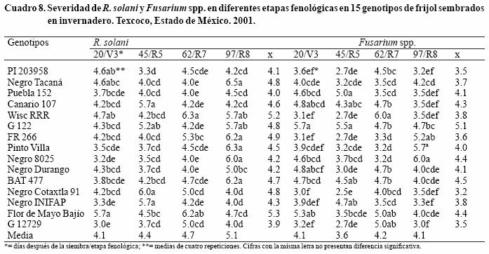 En la etapa V3 G12729 mostró el menor grado de severidad (3.0) seguido de Puebla 152, PI203958, Negro Durango y Negro 8025 (Cuadro 8). En R6, Wisc RRR y Flor de Mayo Bajío mostraron valores de 6.3 y 6.2, respectivamente; posteriormente, disminuyeron aunque en el caso de Wisc RRR la disminución no fue significativa (5.7) y en Flor de Mayo Bajío la incidencia descendió hasta 4.7; estos resultados contradicen lo mencionado por Tu (1991), quien reportó a Wisc RRR como resistente a R. solani y Fusarium spp. El resultado anterior sugiere alta agresividad de los patógenos en esta zona o que están presentes diferentes razas patogénicas a las utilizadas en la investigación mencionada. De todos los genotipos evaluados, en promedio, G 12729 (silvestre) mostró la menor severidad (3.9) del ataque de R. solani.