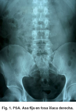 Se le toma una placa simple de abdomen evidenciando asa fija a nivel de fosa iliaca derecha (Figura 1).