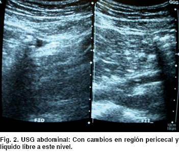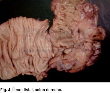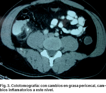 Se propone estudio ultrasonográfico abdominal donde se notan cambios en región pericecal y líquido libre a este nivel (Figura 2). Así como colotomografía denotando cambios en grasa pericecal, cambios inflamatorios a este nivel. Por lo que se decide someterlo a exploración quirúrgica (Figura 3). Se realiza laparotomía exploradora, encontrando líquido libre purulento a nivel de fosa iliaca derecha, y se evidencia a nivel de ciego, remanente apendicular de aproximadamente 1 cm, con cambios isquémicos, y perforación a nivel de la base del ciego. Se realiza hemicolectomía derecha con ileo-transverso anastomosis latero-lateral, y se envía pieza quirúrgica a patología (Figura 4).