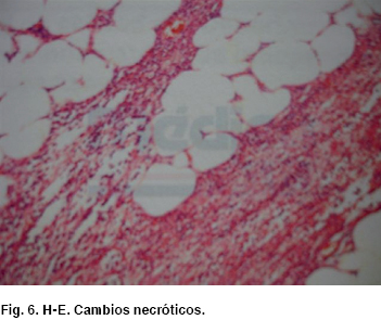 • Descripción microscópica: Infiltrado inflamatorio (Figura 5) y cambios necróticos (Figura 6).
