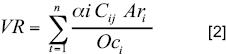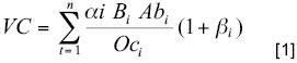 Donde VC es el valor de captación hídrica del bosque ($/m3), αi, es la importancia relativa del bosque en la cuenca i en función del recurso hídrico (%), Bi es el costo de oportunidad de la ganadería versus bosque en la cuenca i ($/ha/año), Abi es el área con bosque aprovechable en la cuenca i, Oci es el volumen de agua captada por bosques de la cuenca (m3/ha/año) y βi es la valoración de la calidad del agua de escorrentía captada por el bosque (%).