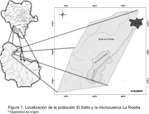 En el ejido La Victoria se asienta una parte importante de la localidad El Salto, cuya población que se beneficia del SAH asciende a 21 793 habitantes (INEGI, 2005). La superficie de la microcuenca es de 944 ha y se ubica aproximadamente a 6 km de El Salto (Figura 1). El ejido es un núcleo agrario dotado por resolución presidencial el 18 de mayo de 1961 conformado por 98 ejidatarios. Se ubica en la región hidrológica núm. 11 (PresidioSan Pedro) en la vertiente del Pacífico, en la parte alta de la cuenca del río Presidio. La presa La Rosilla II construida sobre el cauce del arroyo La Rosilla se ubica a su vez en la microcuenca RH11Dc04028. Esta corriente de agua, después de cruzar El Salto, recibe el nombre de quebrada El Salto, para posteriormente convertirse en el río Presidio (CFE, 1998).