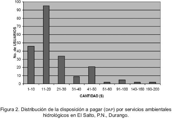A pesar de la tendencia de la curva de la distribución probabilística de la DAA, los resultados indican que en promedio ésta fue más alta que la DAP. La DAA fue estimada en $320,00 por mes mientras que la DAP en $17,18/mes. Los resultados coinciden con la mayoría de los estudios de valoración contingente en donde la DAP es menor que la DAA (Mitchell y Carson, 1989). En este caso, los ejidatarios tienden a exigir una mayor compensación por el no aprovechamiento de sus recursos forestales y favorecer la captación y almacenamiento de agua en la presa "La Rosilla", mientras que los usuarios a pagar menos por un potencial incremento en la calidad/cantidad en el servicio. Sin embargo, al generalizar los valores para su población respectiva, la DAP fue obviamente más alta que la DAA. La DAP total para la población de El Salto, considerando un total de 5 689 viviendas (INEGI, 2005), se estimó en $1,17 millones por año con un rango de variación (basado en el coeficiente de error estándar) de $1,11 a $1,32 millones por año, mientras que la DAA total para el ejido La Victoria, considerando un total de 98 ejidatarios, se estimó en $376,000/ año variando entre $280,000/año y $472,000/año.