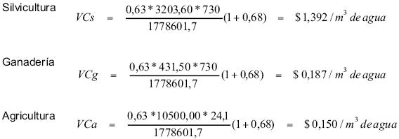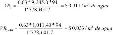 b) Valor de recuperación. Aplicando las mismas modificaciones realizadas al significado de la variable Oci en el modelo [2], en el cálculo del valor de recuperación se consideró el volumen de agua de escorrentía anual ajustado por la superficie arbolada entre la superficie total de la microcuenca La Rosilla; el valor ponderado de 63% que los usuarios del SAH asignan a la importancia del bosque para la existencia del agua y el número de hectáreas a reforestar, aproximadamente 10% de la microcuenca, es decir 94 ha. Al aplicar estos datos en el modelo [2] se obtiene un valor de recuperación de $0,311 por metro cúbico de agua para el primer año (VR1) y de $0,033 por metro cúbico de agua para los años siguientes (VR210) como se puede observar a continuación: