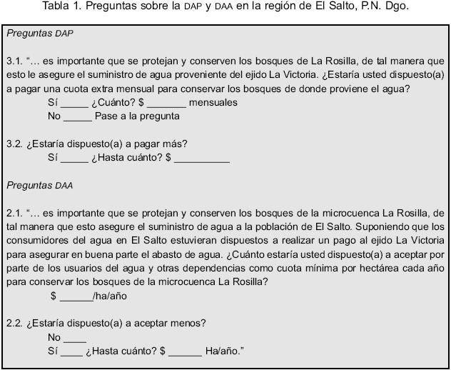 El método más comúnmente usado en la estimación de la DAP es la valoración contingente (Mogas et al., 2006). Este método puede evaluar la DAP o DAA y determinar los factores más importantes que motivan al usuario a pagar o aceptar cierta compensación por un incremento en la calidad del servicio (Mitchell y Carson, 1989). La diferencia entre estas dos medidas está en la forma de evaluar cómo un individuo responde, por un lado, a las ganancias y por otro, a las pérdidas (Brown y Gregory, 1999). Otra diferencia importante es la manera de redactar las preguntas. En este estudio, a los usuarios (i.e., pobladores de El Salto) se les preguntó la cantidad de dinero que estarían dispuestos a sacrificar de sus ingresos para obtener un mejoramiento en la calidad/cantidad de agua que actualmente reciben. Al proveedor del servicio (i.e., ejidatarios) se le preguntó la cantidad de dinero que estaría dispuesto a aceptar en compensación para proteger el área de captación de la microcuenca y favorecer la producción de agua para consumo doméstico. La versión exacta de las preguntas en cada caso se presenta en la tabla 1.