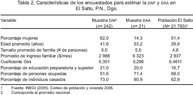 La tabla 2 presenta un resumen de las características de los encuestados. Los factores demográficos más contrastantes entre usuarios y ejidatarios son el ingreso familiar y el porcentaje de mujeres que participó en las encuestas. El ingreso de los ejidatarios es el doble del ingreso percibido en promedio por los encuestados de la DAP. Además, el coeficiente Gini, una medida de la desigualdad económica, es más bajo para la muestra DAA que la DAP. Bajos coeficientes Gini sugieren que hay menos desigualdad económica y mejor distribución de la riqueza. Una posible explicación del alto porcentaje de mujeres en la encuesta DAP es que 41% de la muestra reportó la ocupación como "ama de casa", actividad mayoritariamente realizada por las mujeres en el hogar y las encuestas fueron hechas directamente en la vivienda. En contraste, sólo 14,3% de los encuestados de la DAA fueron mujeres. Los derechos de ejidatario se otorgan a los jefes de familia que generalmente son hombres. Estas características demográficas fueron comparadas con los datos del INEGI para la población de El Salto, P.N., encontrándose diferencias y similitudes en las variables. De manera general, los datos de estas encuestas se consideran aceptables dados los niveles de confiabilidad (95%) y error de muestreo (±6%) usados en la estimación del tamaño de muestra.
