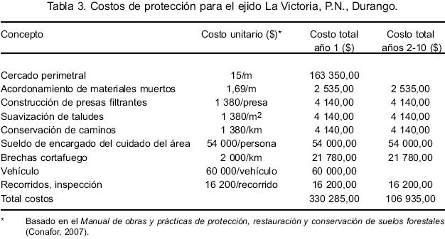 c) Costo de protección. Los costos de protección se basaron en el programa de manejo forestal para el ejido La Victoria (Hernández, 2007). En ese documento se especifican las actividades y metas a realizar para proteger especialmente la regeneración y el suelo. El costo total para el año inicial fue estimado en $330 285 y $106 935 para los años 2 al 10 (Tabla 3).