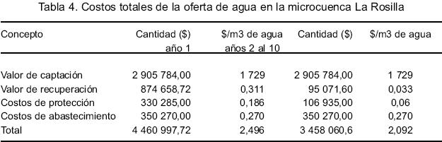 El VR corresponde al costo en que se debe incurrir para el establecimiento y mantenimiento de las plantaciones forestales en la microcuenca La Rosilla. Varía en el año uno de los años siguientes (dos al 10) debido a la reducción del costo relacionado únicamente con el mantenimiento de la plantación. La suma de los valores de captación y de recuperación resulta en un monto total de $2,04 por metro cúbico de agua para el primer año y de $1,76 por metro cúbico de agua para los años posteriores (2 al 10).