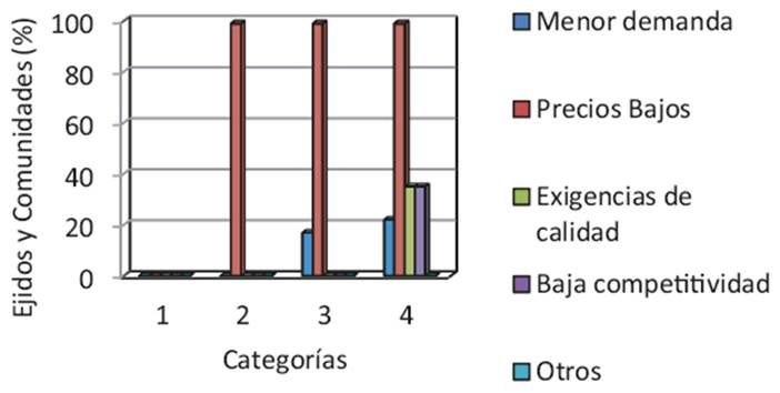 Por otra parte, los EyCF no cuentan con estudios de mercado y planes estratégicos para la comercialización de productos forestales; además, la percepción de los productores identifica como principal problema los precios bajos en productos de importación y, en consecuencia, baja demanda de los propios.