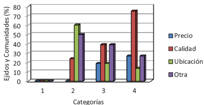 Adicionalmente, en la Figura 3 se observa que para las categorías 3 y 4 (mayor nivel de integración), la calidad es el factor que más afecta la competitividad de productos forestales de EyCF.