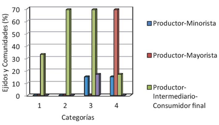 En la Figura 4, se ilustran los procesos de comercialización identificados; tal como se muestra, en los casos más frecuentes (categorías 1, 2 y 3), el proceso se da con la participación de productor-intermediario-consumidor final, que en muchos casos no ofrece las mejores condiciones para el intercambio comercial. A la vez, se observa que en la cuarta categoría predomina la participación de productor-mayorista dado su nivel de integración.