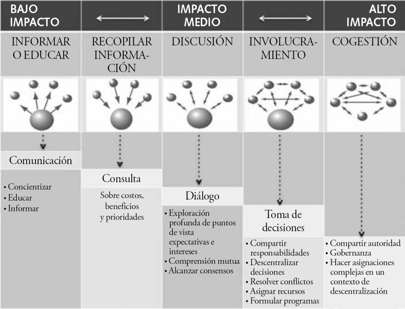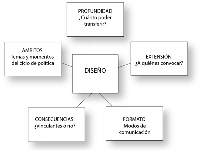 Como en todo fenómeno complejo, en la participación ciudadana se mezclan e implican diferentes dimensiones; la síntesis de dichas dimensiones representa, a su vez, el espacio disponible para el diseño de políticas y procesos participativos. Al distinguir las diversas dimensiones implicadas, se reconocen e identifican una variedad de niveles y decisiones que es preciso considerar al diseñar estrategias para involucrar a la ciudadanía en la toma de decisiones o en la implementación de las políticas públicas.