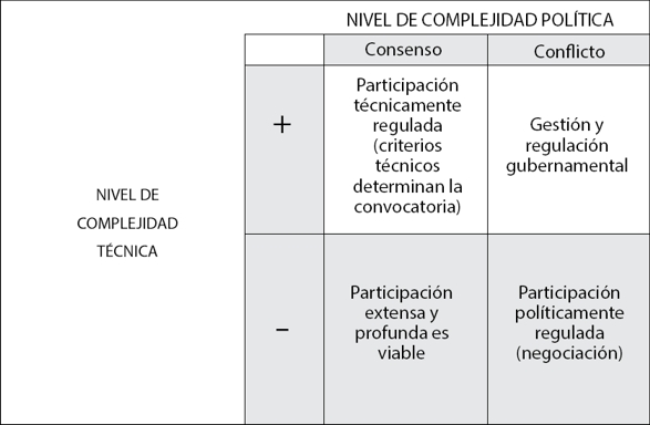 Las políticas técnicamente muy complejas requerirán una participación técnicamente gestionada (es decir, que los criterios técnicos sean los que orienten las decisiones acerca de quiénes deben de participar). Lo anterior no significa que se excluya la participación ciudadana, pero es recomendable que incluya fundamentalmente a expertos que puedan apoyar con sus conocimientos y experiencia a formular soluciones para los problemas en cuestión con el fin de que se produzca una participación informada. Dependiendo la gravedad del caso, también pueden emplearse mecanismos deliberativos que incluyen la capacitación sobre las temáticas a tratar y sobre las implicaciones de las distintas alternativas. Respecto al nivel de complejidad política, se valora el nivel de consenso o conflicto involucrado. Las políticas que suponen un alto nivel de conflictividad requieren una gestión de la participación con base en criterios políticos; es decir, en principio deberían estar incluidos los actores y posiciones que pueden oponerse a las políticas propuestas e impedir su implementación. Por su parte, los actores gubernamentales deberán mediar entre las distintas posiciones procurando siempre evitar la confrontación. En este tipo de casos se recomienda el empleo de mecanismos que fomenten el entendimiento de las distintas posiciones y que ayuden a la cooperación. El gobierno debería mantener la directriz y el control de una situación o problema que implica un alto nivel de complejidad técnica y un alto grado de conflictividad política; en estos casos lo recomendable es que las decisiones se mantengan en el ámbito del gobierno aunque éstas puedan apoyarse en mecanismos consultivos siempre y cuando se informe a los participantes que el gobierno se reserva la decisión. En el otro extremo, una participación extensa y profunda es viable en situaciones en las que el nivel de complejidad técnica es bajo y prevalece un amplio nivel de consenso sobre los temas a tratar (Cabrero, 1999, 82-90).