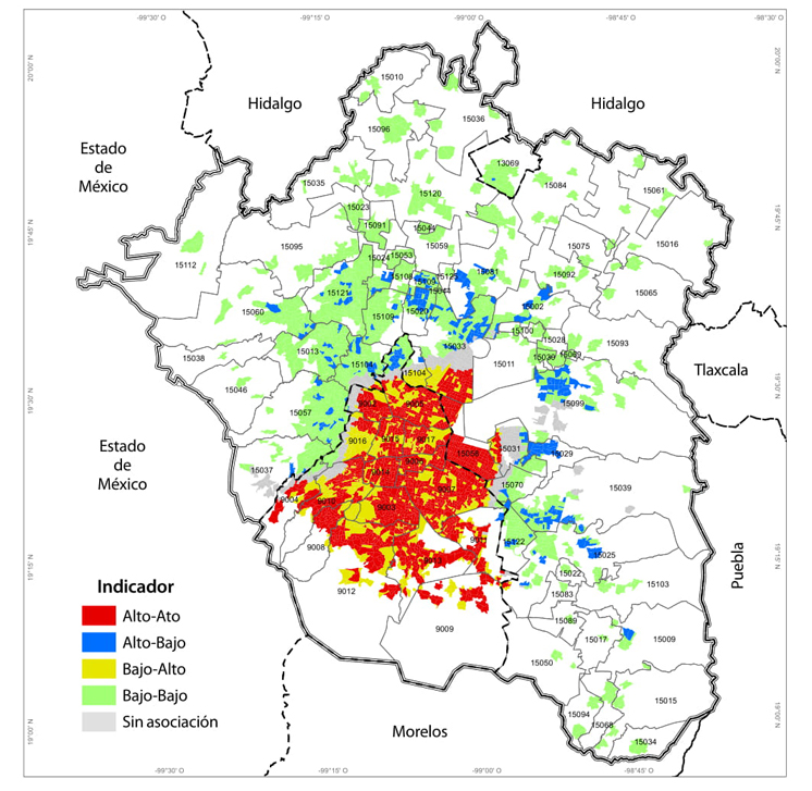 Para determinar estadísticamente las áreas de mayor presencia de derechohabientes del ISSSTE en la ZMCM se realizó un análisis de autocorrelación espacial a escala de AGEB. Para Anselin (1995), este tipo de análisis ayuda a identificar la tendencia de aglomeración o dispersión de valores entre áreas contiguas: la agrupación de valores altos o bajos de la variable analizada indican autocorrelación espacial positiva, y de valores dispersos autocorrelación espacial negativa. Se utilizó el estadístico de asociación espacial Local de Moran I i que calcula los indicadores locales de asociación espacial o lisa (local indicator of spatial association):