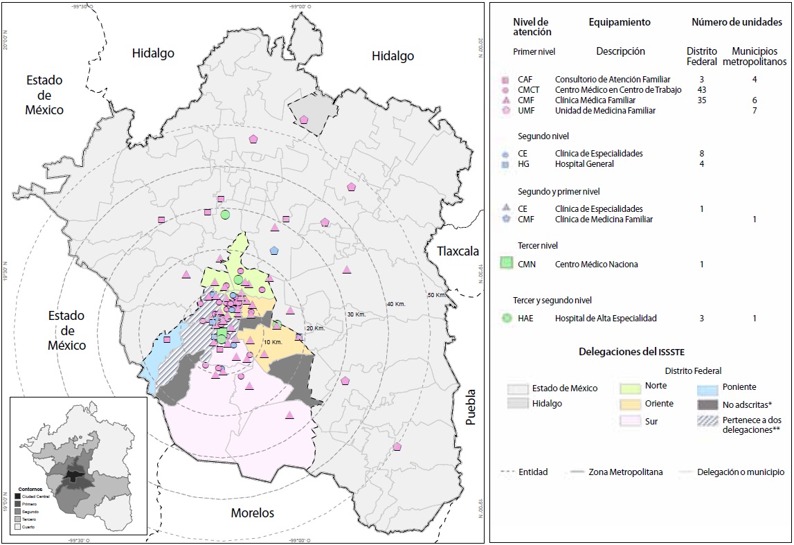 En síntesis, el patrón de localización y cobertura del equipamiento para la atención médica de los tres niveles de atención del ISSSTE configura una morfología en red de tipo radiocéntrica, caracterizada por una fuerte aglomeración en la que los tres niveles de atención gravitan en torno al centro metropolitano de salud (Centro Médico Nacional 20 de Noviembre). Entre los factores que condicionan este patrón, está el diseño radial de la red de transporte del centro hacia la periferia y la tendencia de una administración fuertemente centralizada del sistema de salud que influye en la accesibilidad a los servicios de salud para la atención médica en la ZMCM (Galindo, 2016: 86-87).