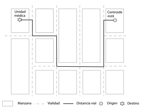 A partir del uso especializado de sistemas de información geográfica (SIG) y con base en la recopilación previa de la información censal sobre población derecho-habiente y de la georreferenciación (puntual), sobre la traza urbana de la ZMCM del equipamiento para la atención médica del ISSSTE, se calculó la distancia por vialidad desde cada AGEB a cada una de las clínicas y hospitales.