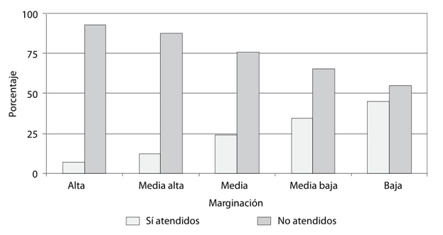 El resultado obtenido muestra que del conjunto de AGEB donde la marginación se reporta como alta, más de 93 por ciento de la población derechohabiente no sería atendida. A medida que la marginación disminuye, el porcentaje de población no atendida disminuye también. Sin embargo donde la marginación es baja, 45 por ciento de los derechohabientes no recibirían atención médica, es decir que la oferta de servicios de salud del ISSSTE en áreas de alta marginación es de la mitad que en aquellas de baja marginación.