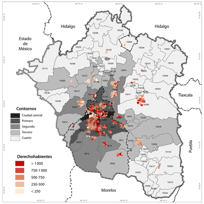 Fuente: Cálculos propios realizados con R Development Core Team (2011); con base en INEGI (2011) para los datos sobre población derechohabiente, y Delgado (1988) para la delimitación de los contornos metropolitanos.