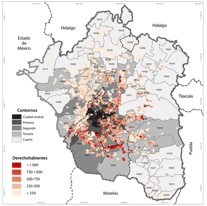 En el otro extremo, los mayores contingentes de población derechohabiente que no recibirían atención médica se distribuyen en el tercer contorno metropolitano, principalmente en la periferia sur y las delegaciones orientales del Distrito Federal y los municipios conurbados del oriente del Estado de México.