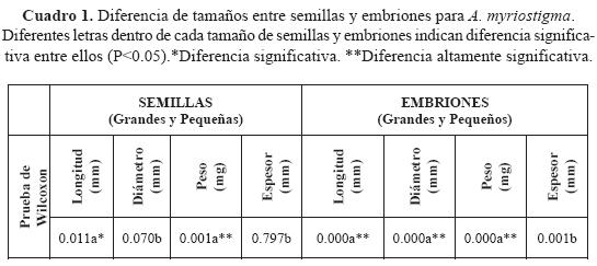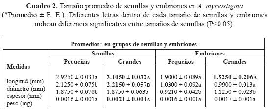 1. Tamaño. La longitud de semillas (grandes y pequeñas) mostró diferencias significativas (F = 0.011; P<0.05) y para peso fue altamente significativa (F = 0.001; P<0.05). Para embriones se encontraron diferencias altamente significativas (F = 0.000; P<0.05) en longitud, diámetro y peso (cuadro 1).