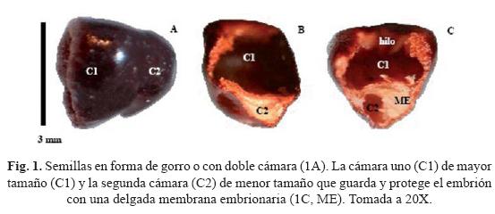 3. Forma. Sin embargo, las semillas poseen "doble cámara". La cámara uno (C1) es la superior y de mayor espacio, mientras que la cámara dos (C2) de menor tamaño posee una membrana embrionaria delgada que protege a al embrión (fig. 1).