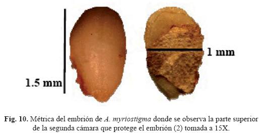 Sin embargo Chapman y Martin (1989) y Schneck (1995) no consideraron la forma de la semilla. De acuerdo con Lauter (2002) las características seminales van ligadas a particularidades del hábitat, y menciona que semillas grandes, ligeras y de forma navícular o de "barco" como las de A. myriostigma flotan en el agua y posiblemente son dispersadas a través de escorrentías provocadas por la lluvia en hábitat con poca elevación. Las semillas que se utilizaron para este estudio, se obtuvieron de una localidad con características topográficas similares a las descritas por Lauter, op. cit., con elevaciones desde 1 170 m.s.n.m. hasta 1 340 m.s.n.m.