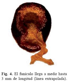 6. Funículo (F). La mayoría de las semillas de A. myriostigma presentan un funículo (F) persistente, alargado, quebradizo, el cual se pierde con el transcurso de los días como consecuencia del desprendimiento de las semillas del fruto y por los movimientos que sufre la misma (observación personal). Mide hasta 3 mm de longitud y a través de esta estructura la semilla toma los nutrientes durante su desarrollo en el ovario (fig. 4).