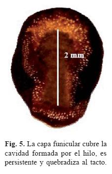7. Capa funicular (CF). La mayoría de las semillas conservan la capa funicular al caer del fruto, la cual es quebradiza al contacto con la superficie (fig. 5). Este cubre al hilo y se considera como una extensión membranosa de la testa (Bravo-Hollis y Sánchez-Mejorada, 1991).