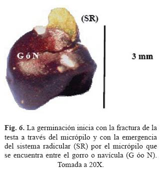 8. Micrópilo (M). No se ubicó con estereoscopía, pero se observó que la mayoría de las semillas germinan por el gorro o navícula donde se ubica el micrópilo como en Barthlott y Hunt (2000), estructura que conecta el embrión con el exterior y por donde inicia la emergencia del sistema radicular (fig. 6). Bravo-Hollis y Sánchez-Mejorada (1991), mencionaron que es pequeño y se ubica fuera del hilo próximo a la región aquillada.