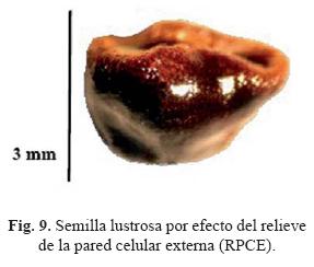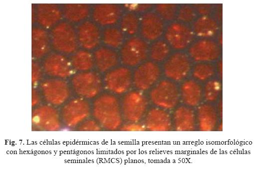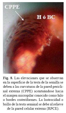 11. Curvatura de la pared periclinal externa (CPPE). De acuerdo a Glass y Foster (1977), la elevación que se observa de las células epidérmicas hexagonales o pentagonales se debe a esta estructura. En A. myriostigma la curvatura es ausente, dando apariencia seminal casi plana; sin embargo, la curvatura se puede observar en los "bordes crateriformes" que forman el hilo como consecuencia de la elevación de las células hexágonoirregulares (fig. 8).
